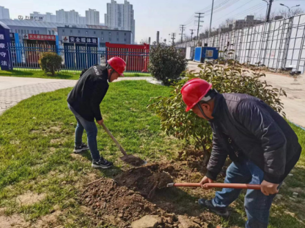 第一分公司紫郡府项目部为学习贯彻公司《环境保护和节能减排管理办法》,树牢安全施工、绿色施工理念。在植树节来临之际,为美化、净化工作环境,增强团结互助意识,项目党员及班子成员带头开展植树活动。