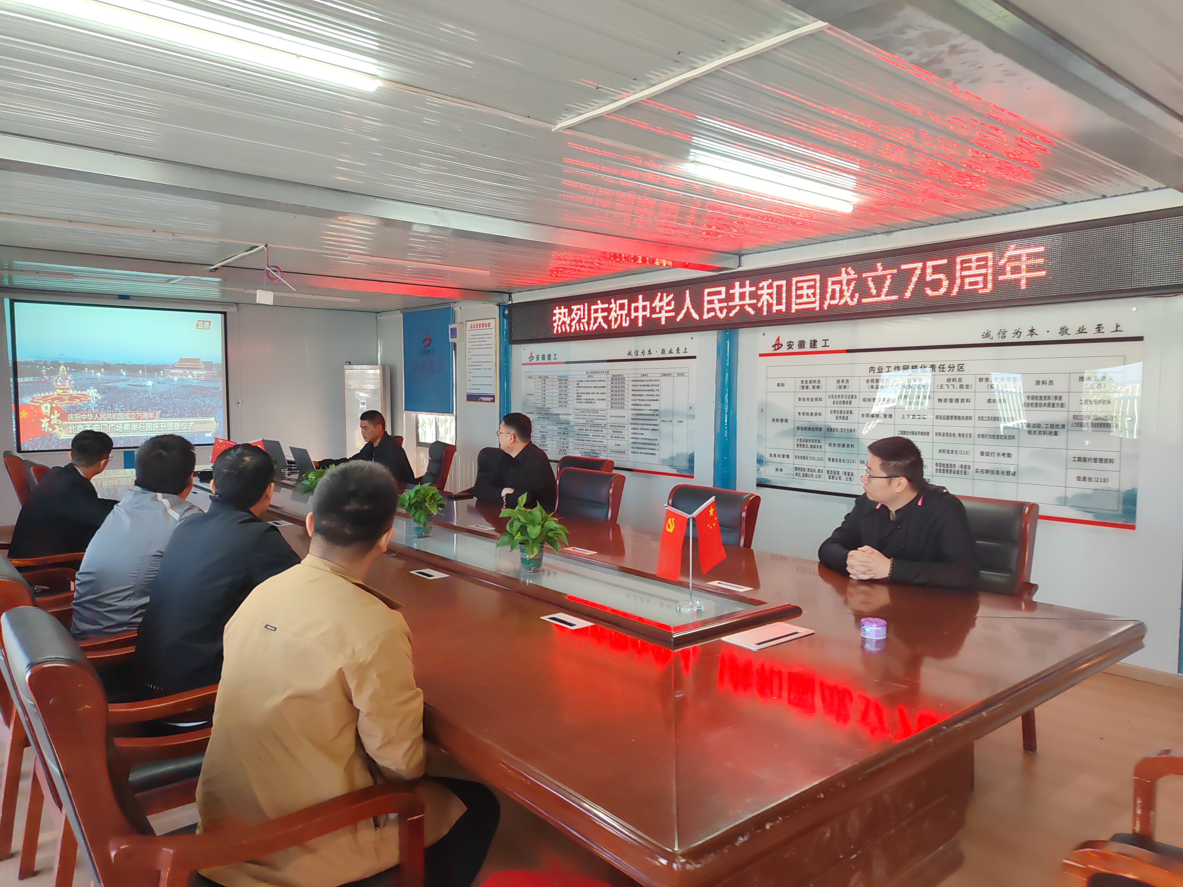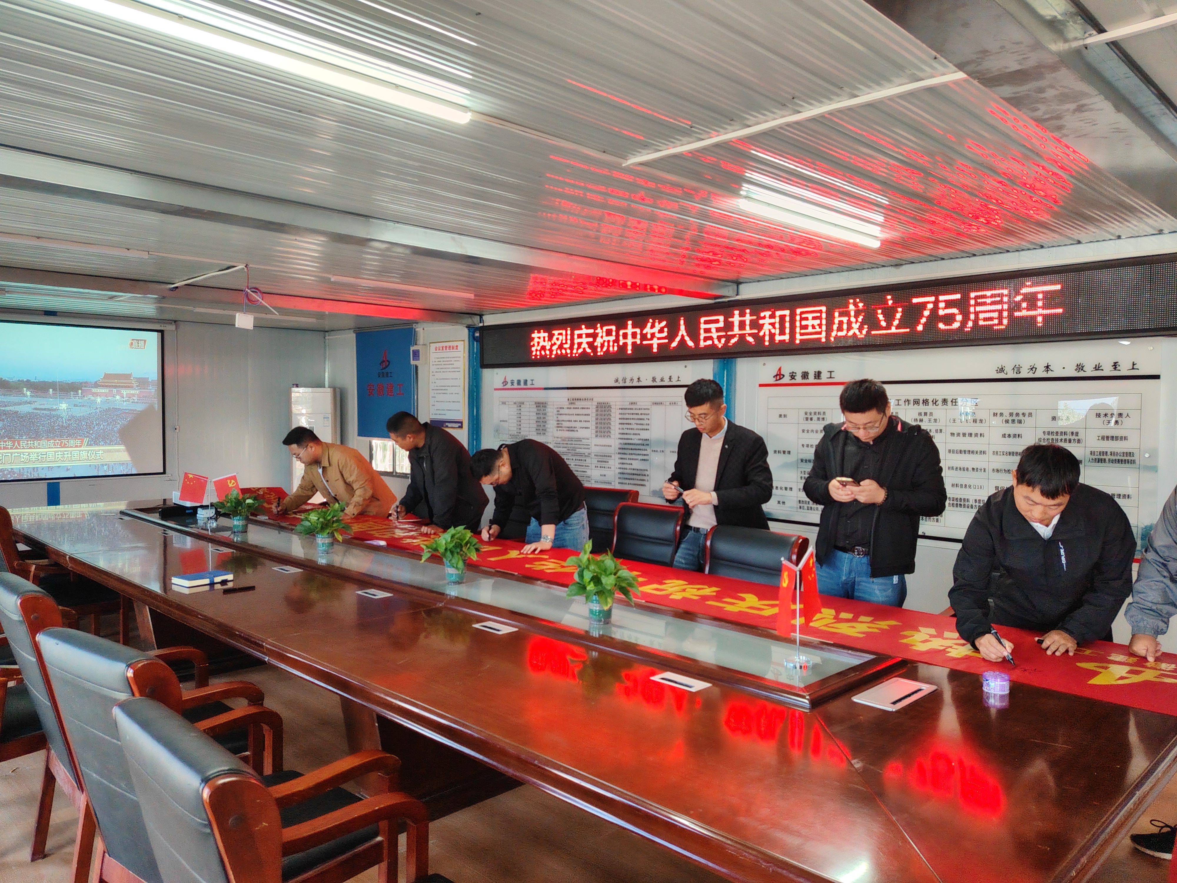 为庆祝中华人民共和国成立75周年,引导项目职工弘扬爱国主义精神,近日,宿徐园区城镇一体化AB地块工程项目部组织开展了“七十五载逢盛世,同心共筑谱华章”系列迎国庆活动,组织职工集中观看天安门升国旗仪式,在庆祝横幅上为祖国写下祝福语,开展“我与国旗合个影”活动。