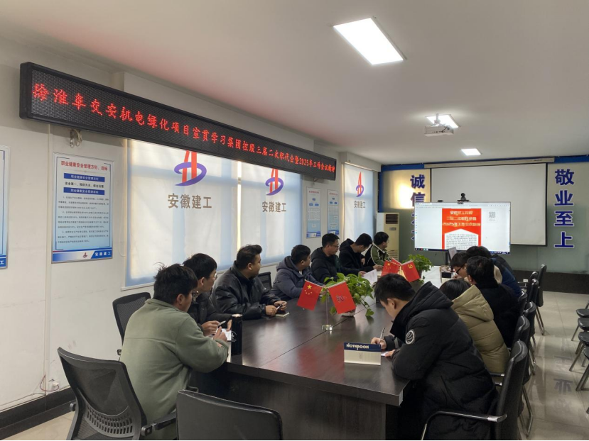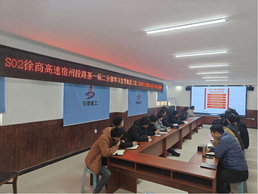 近日 ,安徽建工建设投资发展有限公司组织徐淮阜交安机电绿化项目部和S02徐商高速宿州段一标二分部项目学习宣贯集团三届二次职代会暨2025年工作会议精神,确?;嵋榫裨谙钅恳幌呗涞厣?。