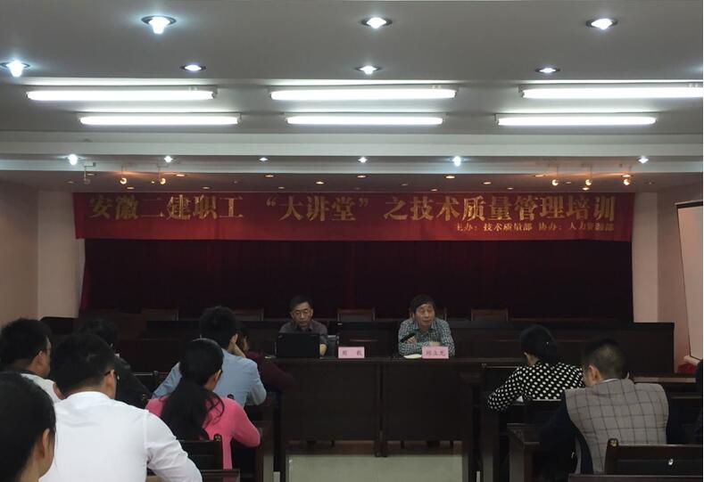 为响应安徽二建职工“大讲堂”活动号召,2016年5月24日上午8:30,技术质量部和人力资源部共同组织的技术质量管理培训在公司三楼会议室举行,公司总工程师邱立龙出席,机关本部所属各单位和项目部共30余人参加培训。
