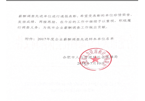 根据人力资源和社会保障部办公厅《关于开展2017年度企业薪酬调查先进样本单位的通知》(人社厅函【2017】68号),我公司领导高度重视,按照通知要求精心组织安排人员,以快速高效严谨的工作态度,圆满完成了此次企业薪酬调查工作,得到了上级部门的充分肯定,荣获了“2017年度企业薪酬调查先进样本单位”殊荣。
