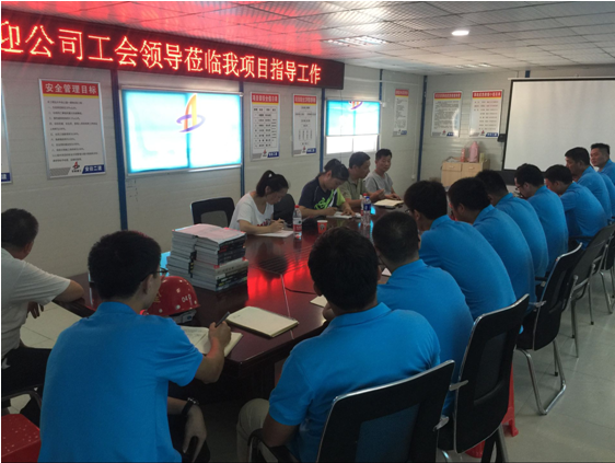 李主席一行到达施工现场,参观了工地,仔细询问了项目概况以及目前施工进度、质量、安全等方面情况,听取了项目工会主席创建“工人先锋号”汇报,对项目班子以“一流工作、一流服务、一流业绩、一流团队”为目标的创建活动给予了肯定,鼓励项目部继续完善,争创集团“工人先锋号”工程。