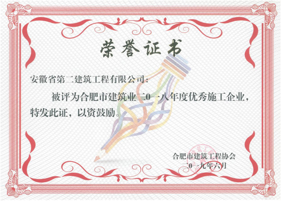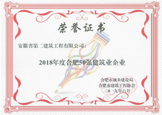 日前,公司被合肥市城乡建设委员会、合肥市建筑工程协会授予“2018年度合肥市50强建筑业企业”、“优秀施工总承包企业”、“质量管理先进企业”、“安全管理先进企业”、“外向输出先进企业”、“统计管理先进企业”、“起重设备安全管理先进企业”。张尚礼同志获“安徽省优秀项目经理”称号,崔俊、?;劬?、任兵三名同志获“合肥市优秀项目经理”称号;蒯家江同志获“合肥市外向输出先进个人”称号;曹建同志获“合肥市安全管理先进个人”称号;王贵宏同志获“合肥市质量管理先进个人”称号;周俊同志获“合肥市起重设备安全管理先进个人”称号。