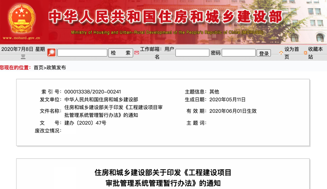 近日,住房和城乡建设部印发《工程建设项目审批管理系统管理暂行办法》。