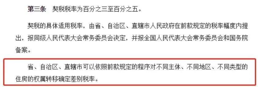 其实,1997年发布的《中华人民共和国契税暂行条例》中,早已规定契税税率为百分之三至百分之五。但各省市可以根据实际情况确定差别税率。