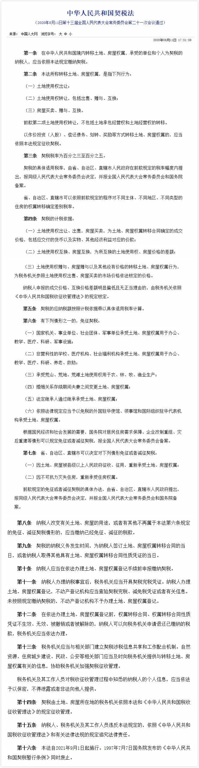 与房屋买卖相关的《中华人民共和国契税法》(以下简称《契税法》)在8月11日的第十三届全国人民代表大会常务委员会第二十一次会议通过,并将于2021年9月1日起施行。