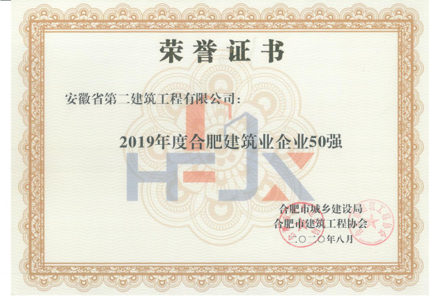 日前,公司被合肥市城乡建设局、合肥市建筑工程协会授予“2019年度合肥市50强建筑业企业”、“优秀施工总承包企业”、“质量管理先进企业”、“安全管理先进企业”、“外向输出先进企业”、“优秀起重设备安装工程专业承包企业”称号。祝超、詹涛、虞捷三名同志获“合肥市优秀项目经理”称号。