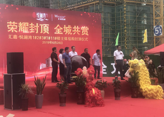2019年6月28日,临泉汇鑫·悦澜湾一期B标段工程7#、11#主体结构封顶?;泠渭懦N窀弊芫碓品伞⒏弊芫硗趵?、 临泉汇鑫置业总经理赵光祥、安徽奥特莱斯企业管理有限公司总经理俞修平、安徽阜阳中盛建设有限公司董事长张军、安徽省第二人民医院副院长段报喜、安徽二建公司第二分公司经理孟庆武等领导出席仪式。
