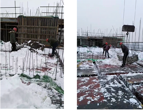 随着“大干60天生产竞赛”的圆满结束,宿州市于元月4日迎来了第一场大范围强降雪。持续了两天的大雪使整个宿州笼罩在一片白色之中,道路全部被阻断,现场施工也一度停滞。为做好极端天气下建筑施工的安全生产工作,一方面项目部紧急成立应急小组,对暴雪造成的安全隐患进行全面排查,尤其对生活区、楼层外架、现场临时用电、起重设备等进行专项检查,及时清理积雪、消除隐患;另一方面为保证雪后施工的正???,项目部动员管理人员对楼顶现浇面的积雪进行清理,为下一步的安全生产提供及时的工作面。