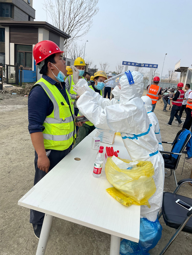 为配合做好核酸检测工作,项目青年志愿者在现场维持秩序、设置点位、划分区域,按10人为一组配合医护人员采集咽拭子。医护人员身着防护服、头戴护目镜,快速精准地为项目管理人员和一线工人采取样本,并进行信息登记。