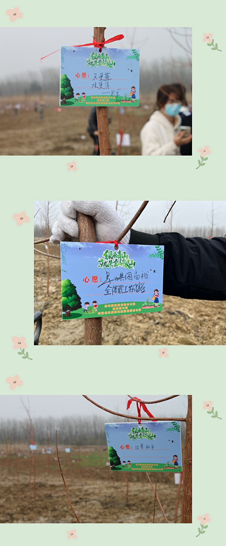 大家个个干劲十足,不畏辛苦,圆满完成了种植任务,还给自己种下的树苗挂上了心愿卡片。