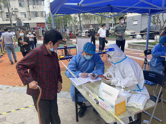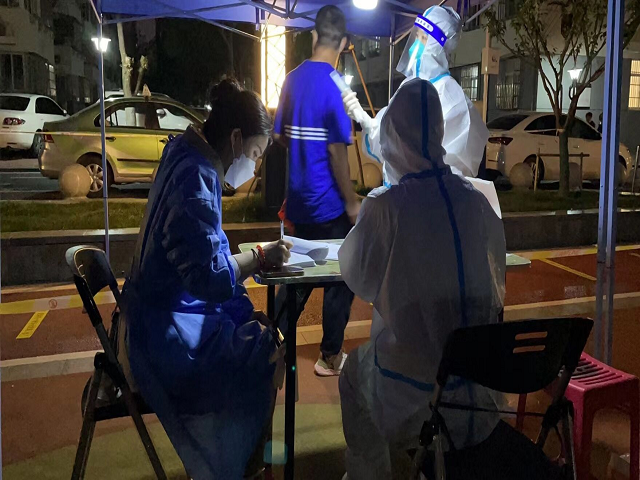 “请大家提前出示安康码和行程码”“没有申请安康码的请打开支付宝或微信扫一扫广告牌上的二维码。”在瑶海区和平家园核酸采集点的青年职工李先舜负责引导居民有序排队、测量体温、检查“二码”。期间,化身暖心“大白”开展“敲门行动”,提供核酸检测采样上门登记服务。