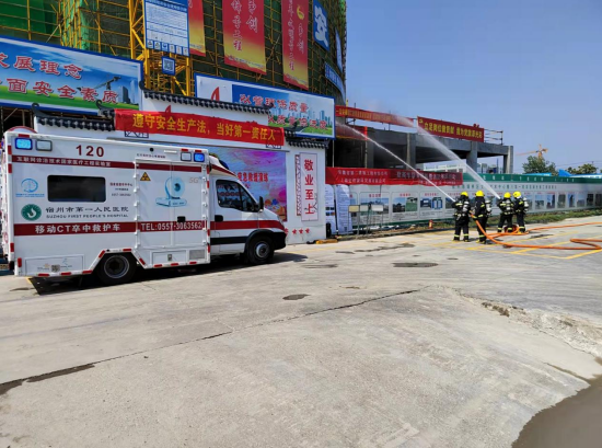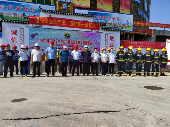 6月24日下午,第四分公司宿州三馆一院一中心PPP项目部与宿州市埇桥区住建局、埇桥区消防救援大队、宿州市城东新区管委会、埇桥区重点局、上海宏信建设发展有限公司联合开展2022年“安全生产月”建筑安全应急预案演练。