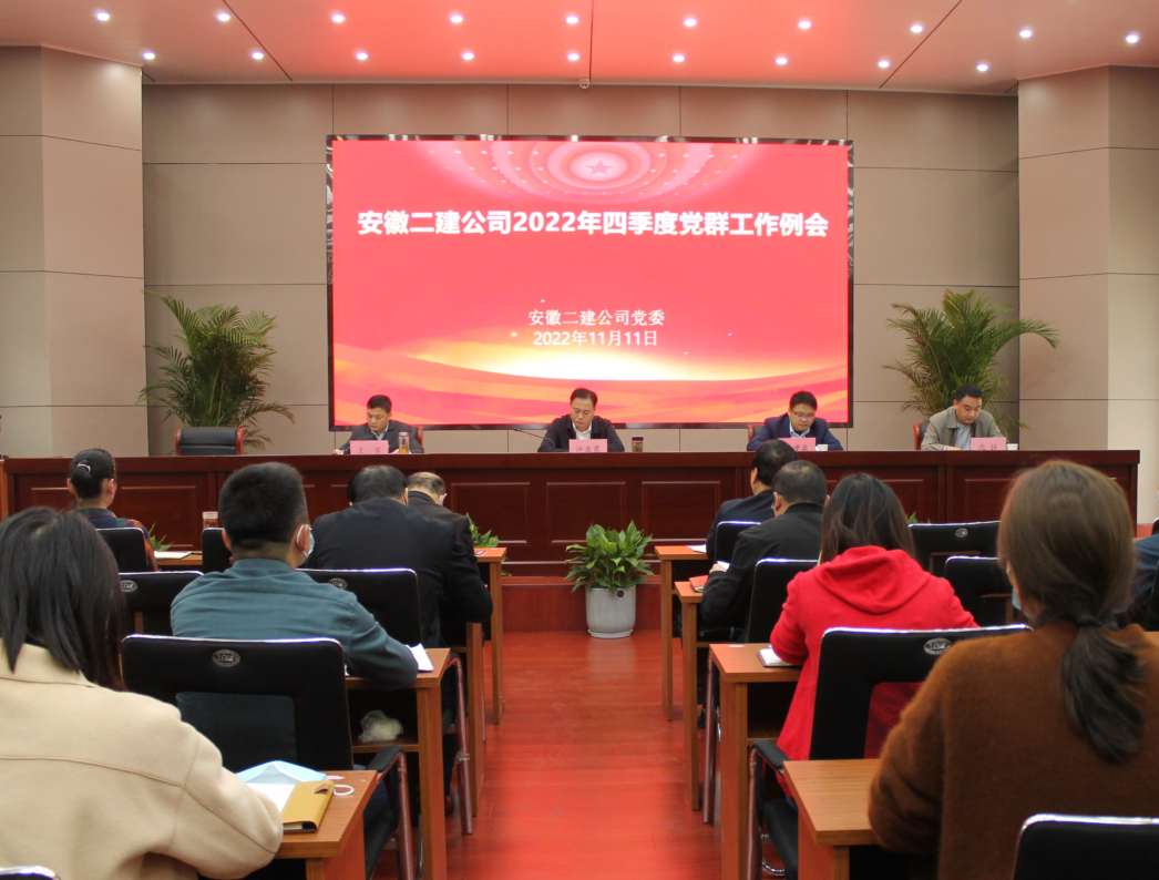 11月11日上午,安徽二建公司召开2022年四季度党群工作例会。党委书记、董事长许业勇出席会议并讲话,公司领导李建成、王军、沈壮出席会议,党群部门人员、所属各单位党支部书记、工会主席、团支部书记、综合办负责党务工作人员参会。会议由王军主持。